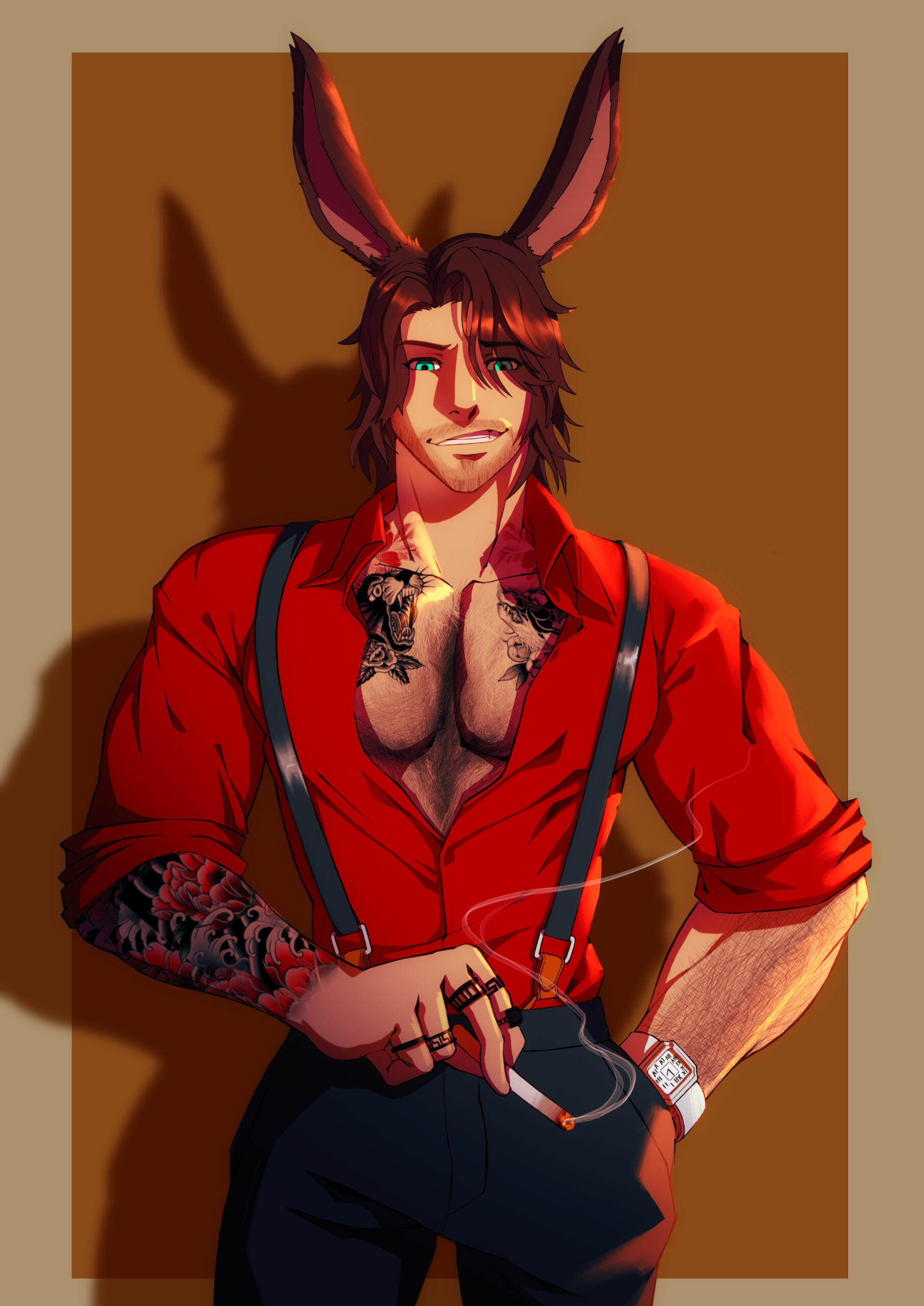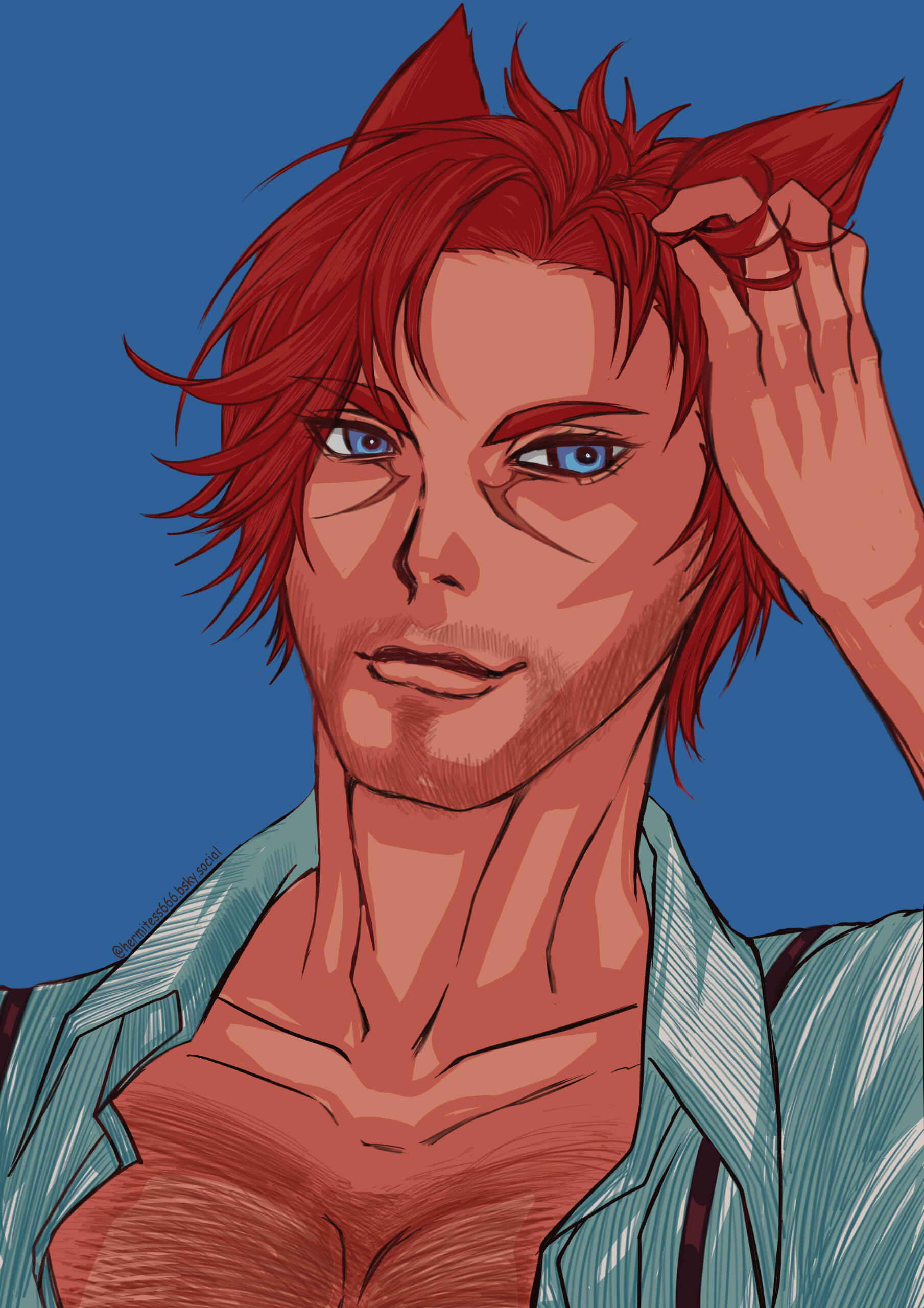 Sean was abandoned as a kit and taken in by reclusive hunter who happened upon him in the forests. He grew up learning how to hunt from his adoptive father, whether it was traps, bows, or whatever you had lying around. It was rough going, his father having little patience for Sean's failures, but it was stable.Whenever his father would take him into town for supplies or to sell excess from their hunting, he could tell how uncomfortable he was, his eyes darting this way and that way, always instructing Sean to stay quiet and speak to no one. It reminded him of the prey they'd corner in the forest, but being so young, Sean thought little of it.When Sean was entering his teen years, he left their tent one night to hunt alone for their dinner, leaving his father to manage the camp. It took him longer than usual to snare something and upon his return he found his father in a pool of blood, the camp ransacked, and signs of a struggle, though not with animals. People. With no time to mourn, Sean quickly went after the responsible party, tracking them down as if they were no more than animals and ending their lives. As their cries of pain became murmurs, he wretched through a sickly smile as the thrill of hunting the bandits tainted him forever. After returning to his camp and burying his father, he left the forest and set off into the wider world.After making a name for himself as a ruthless and efficient mercenary with no qualms doing what needed to be done, he was approached by a member of the Kuroihana crime family and offered a hefty, steady sum of gil to act as a permanent fixture. Knowing they understood the value of his talents, he accepted, wanting a bit more comfort in life and new thrills to seek, quickly becoming a regular bodyguard and intimidating force where he was needed, among other duties...Sean tends to be stoic and seemingly disinterested, though the eyes of a hunter quickly return to anything or anyone that piques his curiosity. His penchant for thrill-seeking in more violent ways remains, though he's sure to keep it in check for the family's sake.